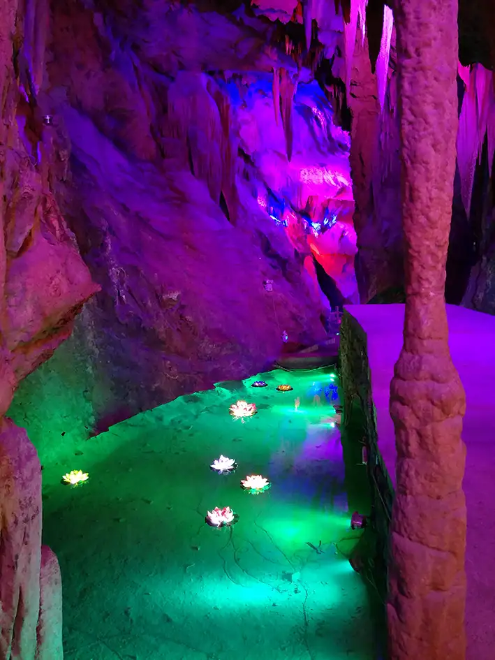 德宏仙佛洞旅游景区位于德宏傣族景颇族自治州芒市勐戛镇风吹坡,是集喀斯特地貌景观与声光电技术于一体的4a级旅游景区。溶洞系统形成于中生代侏罗系中统勐戛组石灰岩,距今约1.4亿年,洞体全长2.8公里,垂直高差超过200米。景区以天然钟乳石群为核心特色,包含太古屏风、贝叶宝库、莲花谷等地质奇观,通过现代光影技术营造出仙境氛围。